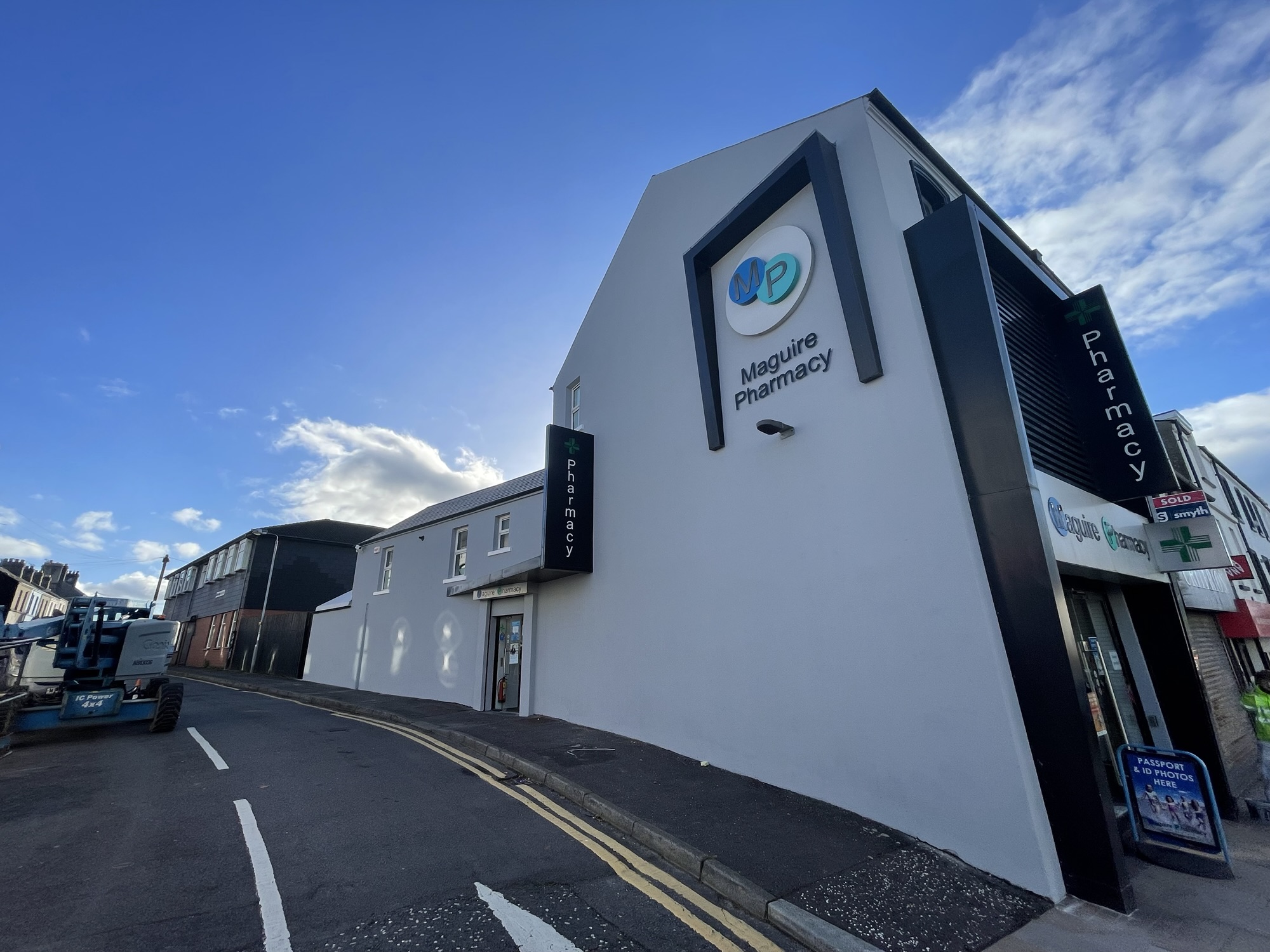 Work is now complete at Maguire’s Pharmacy in Bangor, County Down. As we described in an earlier post, previous paintwork was removed by Doff steamer, the substrate was primed and double coated using silicate primer & masonry.